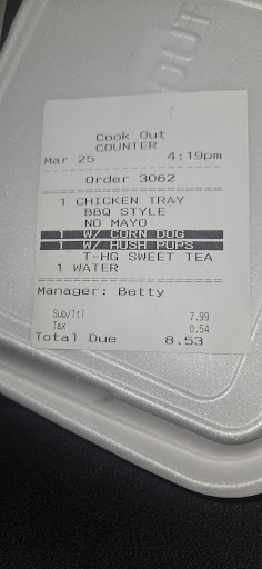 Read moreI thought I would give Cookout another chance despite disappointing experiences at other locations. Unfortunately, this experience was not great. The food is affordable, but why do they keep selling substandard products? Ground beef is only a step above Alpo; it's greasy and strangely doesn't taste like ground beef. To make it worse, you're tasting it all day from burping from indigestion. The staff are friendly enough, but the drive through line is slightly confusing. Why stick another fast food restaurant in a sea of other fast food locations? I don't know the answer to that. It would've been much better if it was a...