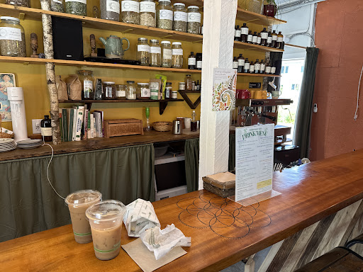 One of the first things you may notice is the wall of herbs and tinctures, many of them grown on that same land. While you visit, you may purchase botanicals and herbs from the garden tender-herbalist-cafe cultivator, Nyeela.