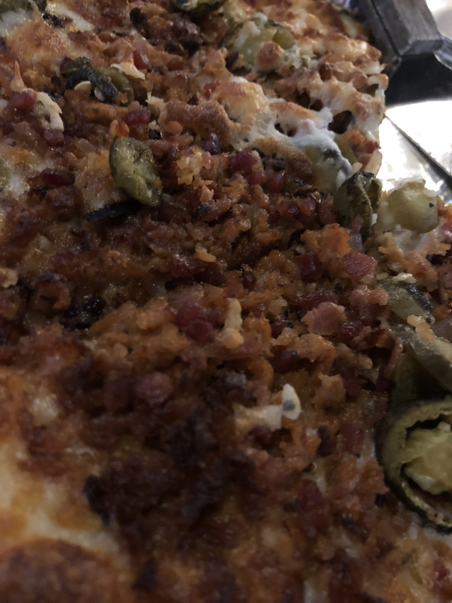 Here is where the service went down. She delivered the pizza and we never saw her again, ever. Not a "How's the pizza?" "Can I get you some more water?" "Do you need a box?" "Are you ready for the bill?" Nothing, we sat there even to the point that I was on my phone sitting sideways and no one was eating pizza at our table any more. She came as close as the next table to us. The only way I could have gotten her attention is if I had walked up to her while she was there. We finally found another gal who was more than happy to get us a box and the bill.