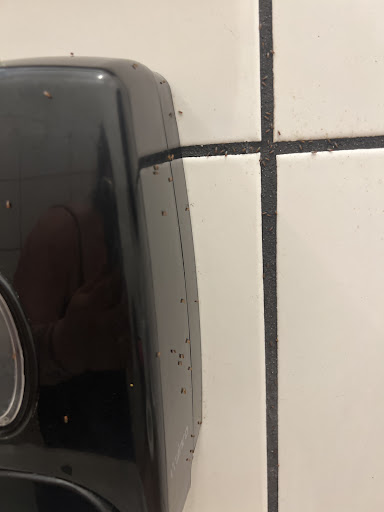 The womenâs bathroom has an infestation of gnats covering all 4 of the bathroom walls. (See picture)