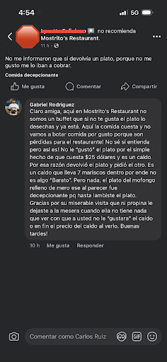 Hoy me veo en la necesidad de alzar la voz, no por capricho, sino por respeto. Respeto a mi esposa, respeto a quienes trabajan duro por su dinero, y respeto a quienes creen que aún existen negocios con integridad. Les comparto una experiencia que tuvimos recientemente en Mostrito’s Restaurant, para que estén al tanto de cómo tratan a los clientes cuando algo no está bien.
