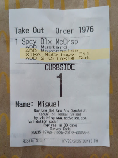 Read moreOn July 28 a little after 8pm on curbside I ordered a Chicken McCrispy with an extra McCrispy fillet, they brought it without only one patty, I had to get out of my car and bring it to them, they apologized, took the sandwich & added another patty, I went to my car, I opened the box to check it, I noticed the extra fillet which I had paid for was less than half on size compared to the first one, I went back for a second time, and the first thing the manager said "Oh no, what now?" I showed the size of the 2nd fillet, and I pointed out that it was way too small compared to the other one, and he checked it out, and said "it's within sellable size" to which I said, I'm not getting another comparable fillet? "No", he repeated "It's within sellable size", I couldn't believe it, then I asked for my money back, then he said "That's going in the trash" very upset, referring to the sandwich. I think what I was asking for was fair, and I don't think the manager that night treated me fairly. I am a regular customer of the McDonald's on Main Street, but this time I was closer to this one on Bill Foster Memorial. I don't come here very often, but now I feel like not coming back. On the McDonald's at Main St. I have been treated...