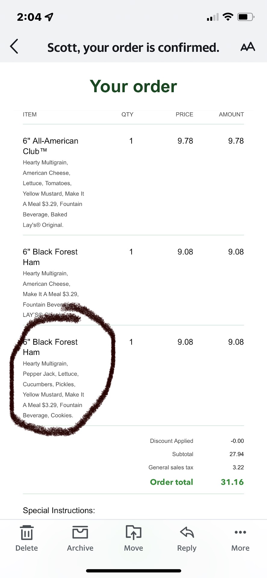 Read moreThe only good thing about this restaurant is the touch screen and the drive thru. But, you would think they could get your order right since they have the information you punched into the screen. Nope, don't think so. They added pepperoni to my wrap that I didn't order and of course charged me for it. I ordered a dozen cookies with nine of them being chocolate chip and three being macadamia. I get home and notice they substituted the macadamia with three oatmeal cookies. They never even let me know they were making a substitution. They put just a little steak on my steak and guacamole sandwich and forgot to put guacamole on it yet once again. If they call it a steak and guacamole sandwich, obviously guacamole comes on it!! I don't know if their workers are being trained improperly or if they are just plain ignorant. My orders have never been wrong when I could go inside and watch them make my food. No more Subway until I can go...