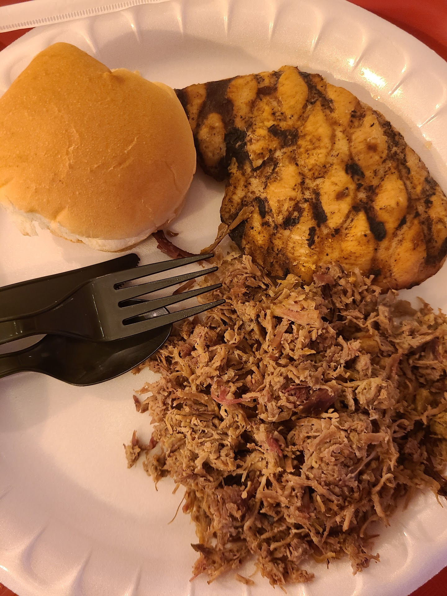 The food was very lackluster. The BBQ didn't have much of of a smoked flavor. The chopped pork tasted like it was cooked in the oven and had no smoke flavor and was dry. The brisket had a mild smoke flavor and was dry. The only meat that was alright was the jalapeño cheese sausage. It was more flavorful and wasn't dry. The only thing that saved the pork & brisket were the sauces.