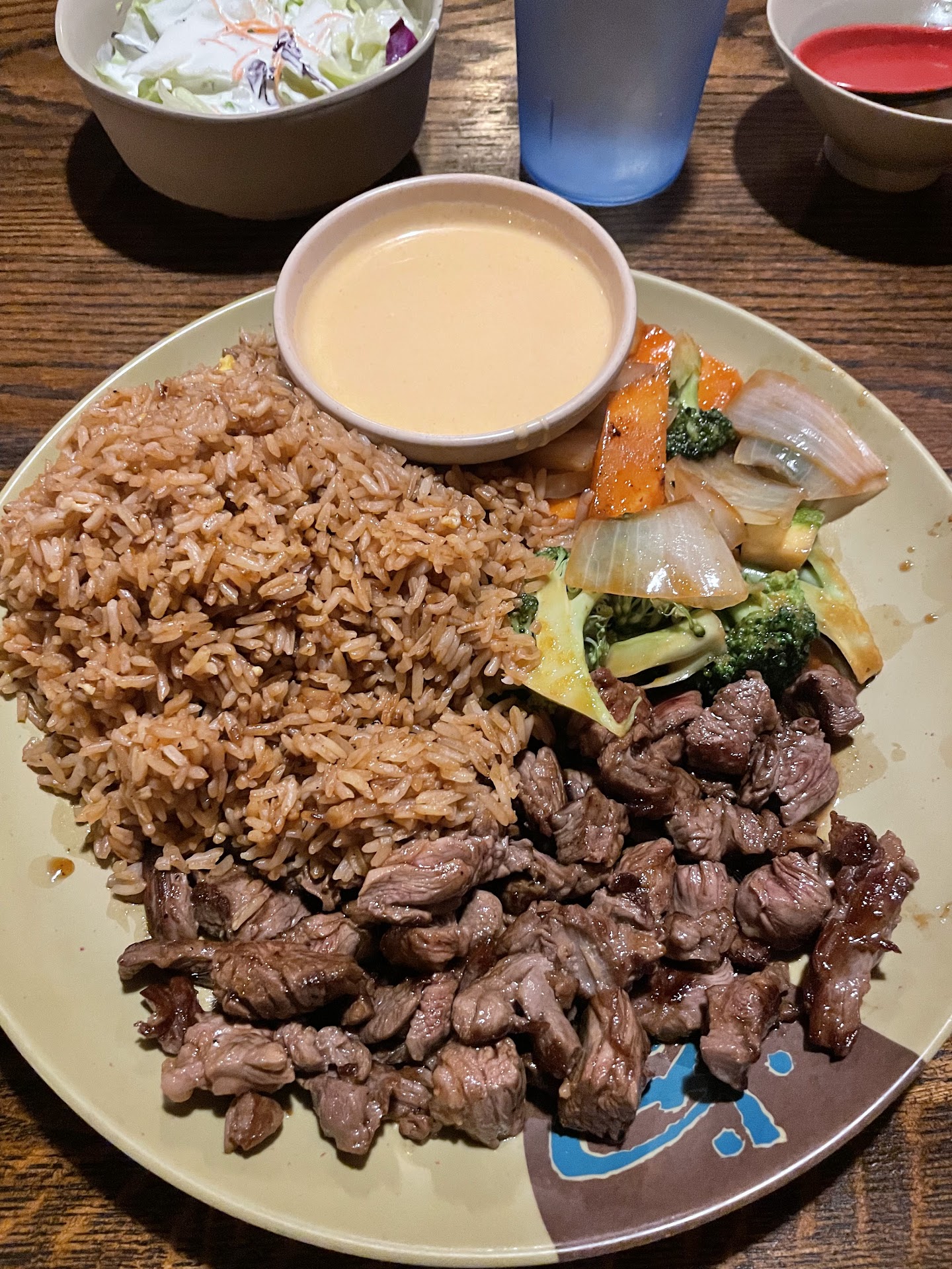 That said, service was impressively fast. Our soup and salad arrived almost immediately after we sat down, and the hibachi was served not long after that, hot and fresh. I ordered the hibachi steak medium, but the pieces were cut so small that they ended up more like medium-well. Still, the flavor was great. The vegetables were heavy on the teriyaki, which actually made them stand out more than the steak or fried rice. The rice itself was solid but couldâve used a bit more seasoning.