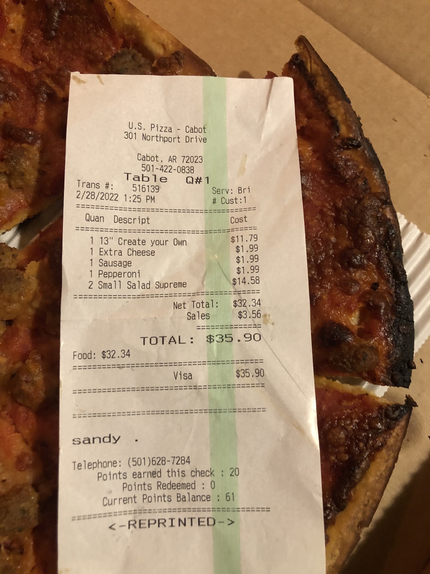 Read moreMy wife ordered a 13” pizza with pepperoni, sausage and xtra cheese. After the three additional ingredients the 13” pizza now has a cost of roughly $16.00. The people boxing the product had to see the condition of the pizza but since it was a to go order and a female they figured nothing would be said or done about it. They were almost right. When I arrived home my darling wife informed me she stopped by U.S. and got a pizza and two salads. I told her what a wonderful wife she was for ordering and picking up dinner. I washed my hands and grabbed a paper plate from the cabinet and opened the box that held my food source for the evening . When I saw what was in the box I immediately slammed it shut thinking something had crawled into the box to get warm and died after overheating. I wasn’t sure what I was looking at but I had to get a better look. I once again opened the box, with a tad bit of apprehension this time. I sorta snuck up on it. As I peeped in on the contents I was certain that this couldn’t be of any use as a food source for even the hungriest of animal. I told my dear wife that I will take some pictures of the offering and place them on their website prior to getting an explanation from the management simply because of the blatant disrespect and disregard for the customer. You will make this right I’m sure but after this honest and thoroughly descriptive encounter I think a refund will be...