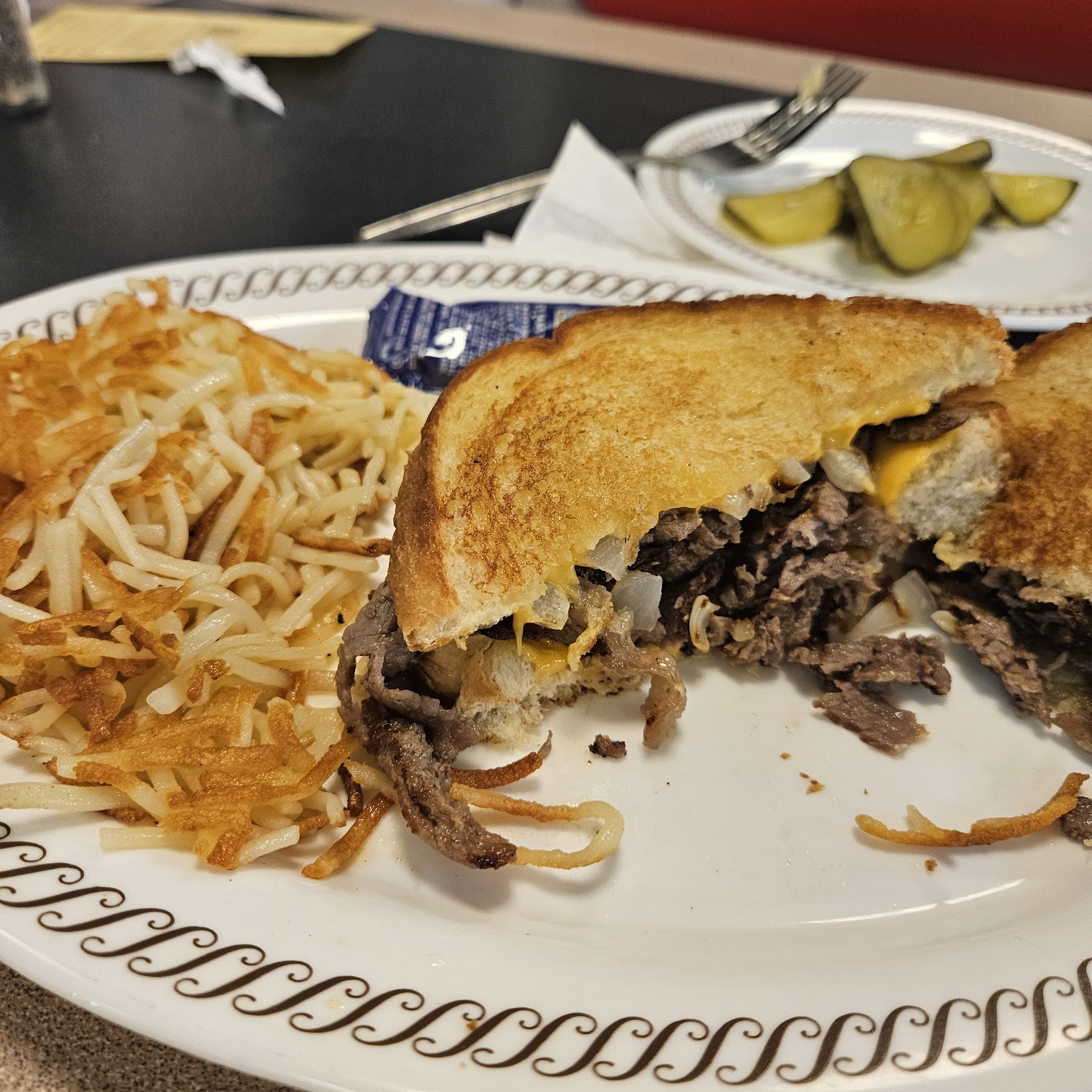 Read moreThis will be a short review. This Waffle House is a carbon copy of all Waffle Houses in the East. Great cook, fast service, delicious food in a no frills atmosphete with time tested fundamentals. The tea had a slight brew flavor, so it was ok, not a home run, but good. The steak-ums for the steak and cheese sandwich was only ok. Not going to win any awards. Some slices had a twinge of spoiling flavor and a little dry. Common for steak-ums. Just the right amount of cheese and onions to get it down the hatch. I enjoyed the hometown feel as regulars popped in and out. Kinda felt like I was in a movie. Overall it quieted the hunger pangs without making me sick. Great choice for a...