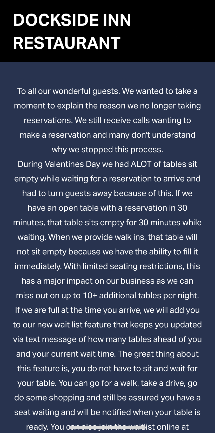 They explain that they now have a waitlist option. They explain it as essentially you show up and if they don’t have any availability, they put you on the waitlist and you can leave and go shopping or whatever, and you will be notified when your table is ready. Pretty typical for most restaurants nowadays.
