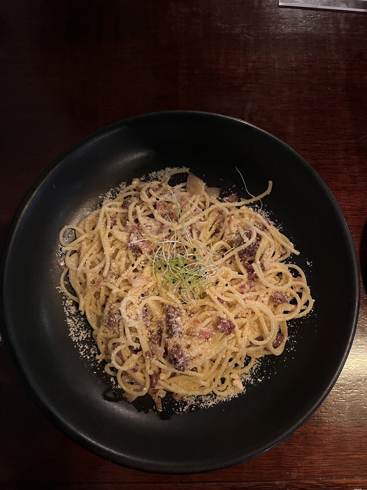 Opté por la pechuga de pollo servida sobre una cama de risotto de parmesano, mientras que mi novia seleccionó la carbonara de cachete de cerdo ahumado con espaguetis. La presentación de ambos platos fue impecable y las texturas, especialmente en el risotto, fueron dignas de elogio. El arroz estaba cocido a la perfección, exhibiendo un dominio hábil del arte culinario. Sin embargo, lamentablemente, los sabores no armonizaban como se esperaba. El risotto carecía de la robusta esencia del parmesano y de los matices aromáticos que son fundamentales para este amado clásico italiano. De manera similar, la pechuga de pollo, aunque estaba expertamente preparada, no llevaba consigo las notas sabrosas típicamente asociadas con este plato clásico.