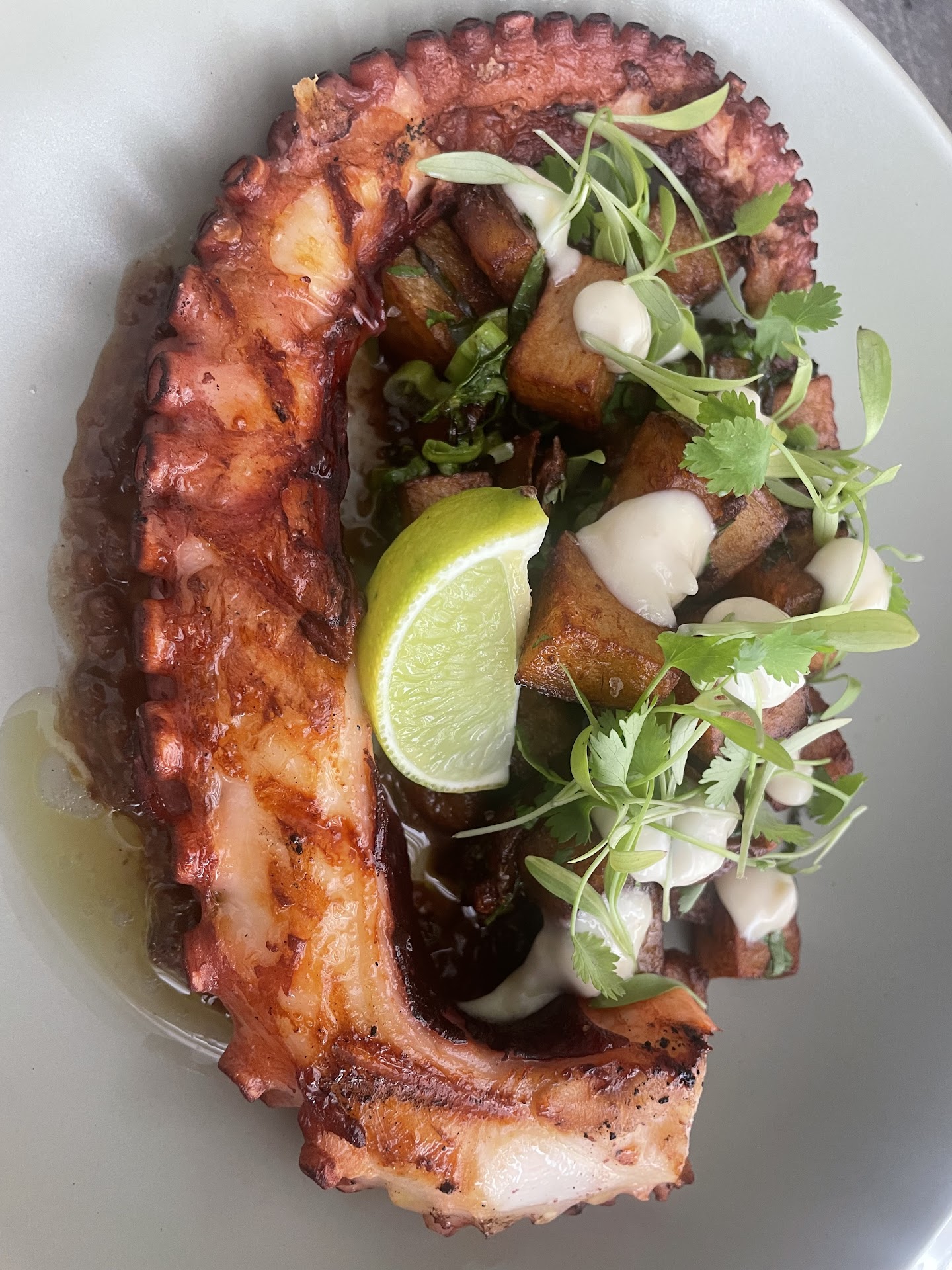 Unfortunately the value of the money is less than ideal. Ordered the grilled octopus and a daily special tartare. The octopus was very savory but for $22.00. We got like 6 pieces of octopus and 10 pieces of breakfast potatoes. The Tartare ($26) flavor was very bland and did not included any type of toasts or crackers . I have had much better at local food trucks.