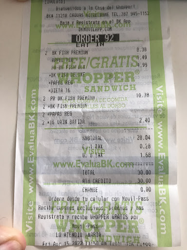 Acostumbran a no darte el total cuando ordenas, tampoco el recibo. La razón es que si no estas pendiente te cobran mucho más. En una orden cuya suma total eran $17 dólares aproximadamente con ivu me cobraron más de $21. Durante la orden le dije NADA AGRANDADO, me estaban cobrando el combo agrandado más estaban cobrando $1 dolar adicional por cada batida a lo que dice la pizarra. Al final cobraron 19 dólares aproximadamente y no dieron recibo de orden. Las batidas aguadas y la comida fría, el queso ni siquiera se...