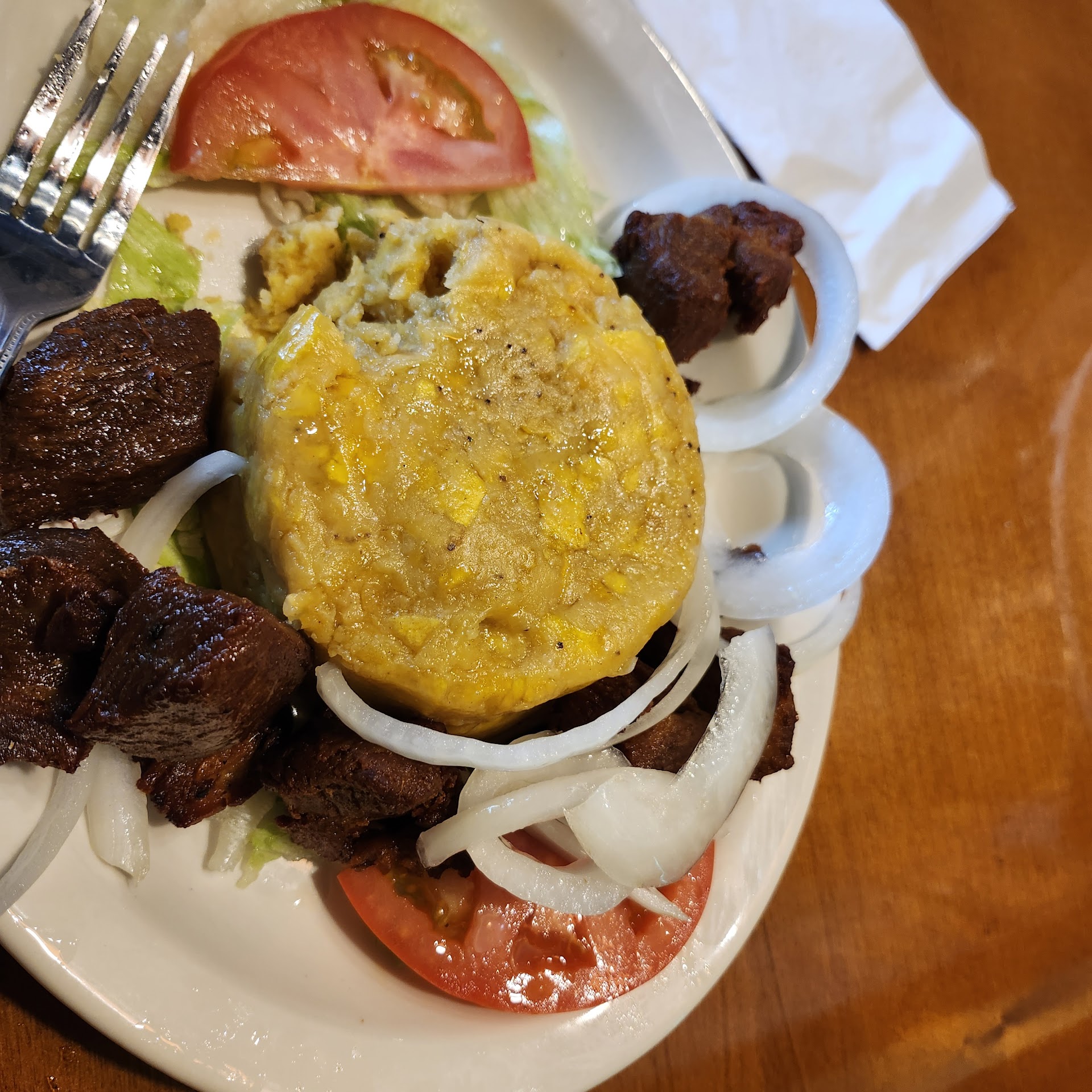 A work buddy of mine recommended this place and I ordered green plantain mofongo they served sweet plantain mofongo, when finally recieved the green plantain mofongo, it had no taste I added some Mayo Ketchup and was able to consume but it wasn't right, it had no garlic, no olive oil or bacon fat, I left half of it, then I sort remembered the taste it was like if when they prepared it the bowl not rinsed out properly it tasted like dish washing liquid watered down, my wife had a nice cod and island vegetables dish that was very tasty, but with me they bombed out, a supervisor came by to say they were sorry and why I didn't say anything about the 2nd plate they brought me but I said I didn't want to cause anymore issues. Never was told it would be on the house and I don't look to get free meal etc,, but if you are going to serve someone a meal the quality should be held at a high std or don't serve it. Would I return maybe and maybe not.