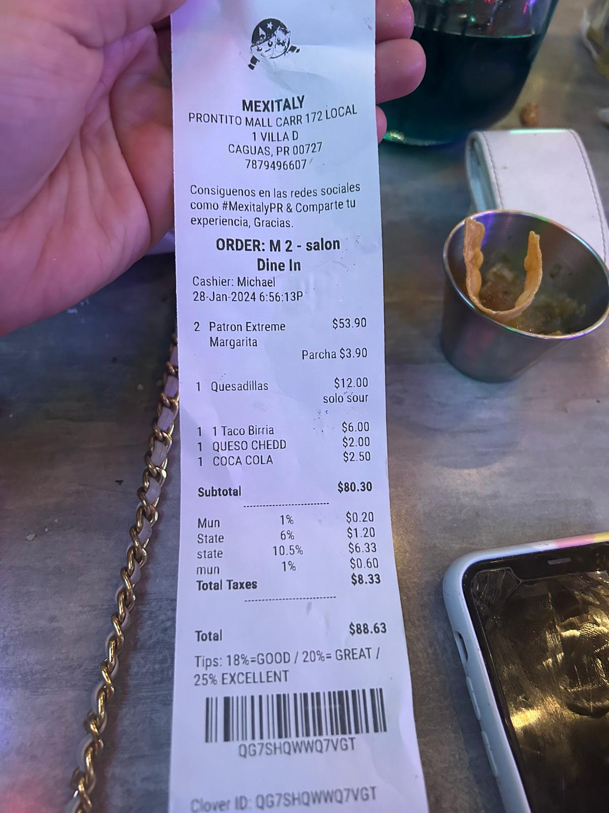 Read moreWORST EXPERIENCE since I came to PR. They gave me a receipt for $34.93 for 2 tacos and two beverages, but when I left I later notice they charged me $72.93. I called them but they gave me the run around, so I drove back down there and asked what the misunderstanding was and they said that the extra charge was a tip. I explained to the so-called owner that was absolutely not the case he got rude with me. I then demanded a refund loudly, and he complied. I started walking out and the little guy says, “don’t ever come back” and said,” No problem thief.” And then he ran up behind me and tried to push me. Horrible place that lies, cheats, and steals. THE BEST MEXICAN RESTAURANT IN CAGUAS...