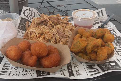 My friend and I opted for the Calabash Crabcake Burger. It was an absolutly wonderful sandwich with shrimp, tartar sauce, cole slaw and a flavorful crabcake. We paired ours with fried okra and hand-dipped onion rings which made for a perfect meal. We took advantage of our beautiful spring day and dined at the outdoor tables where a pig cooker was fired up, smoking fresh pork for pulled barbecue.