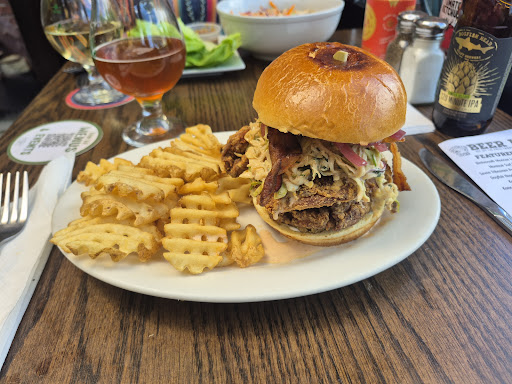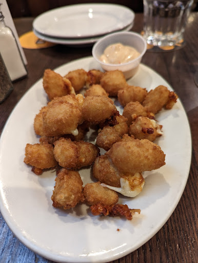 My chum and I were both pretty famished and got the Cheese Curds app ($11.50) in lieu of the aforementioned, dearly departed crab dip. Very solid entry - I liked how the cheese was bursting out at the seams (not sure if that's officially considered a selling point or not). Knowing that I was in good hands, I went for the plain hamburger ($14ish), cooked rare (I won't do rare with an unknown establishment - you run the risk of your dish loudly mooing on the plate versus just quietly mooing). Delicious and remains one of the best in the area. It is mystifying to me how few places truly master the almighty bovine, but this is certainly one of them. Perfectly cooked and delicious.
