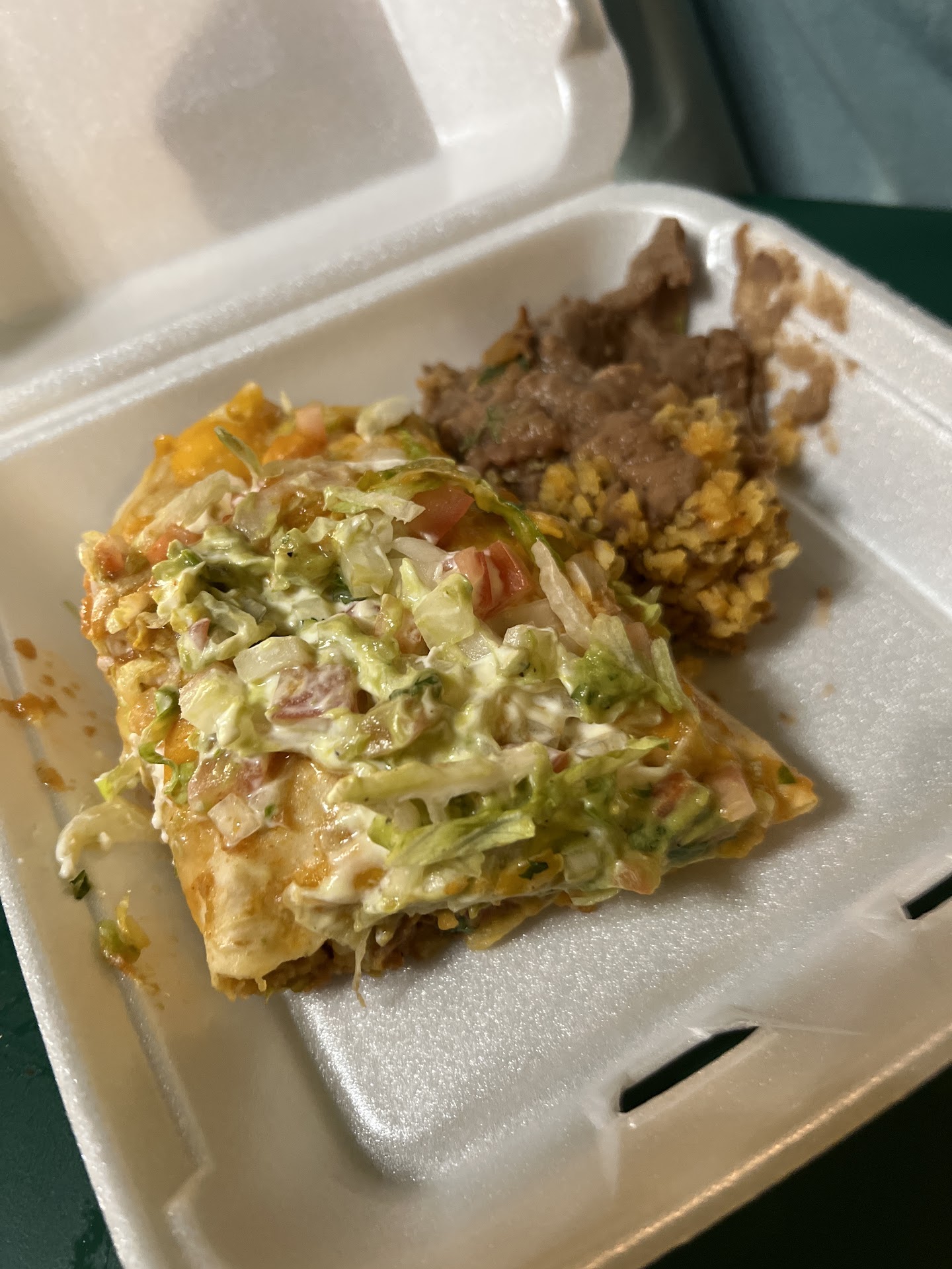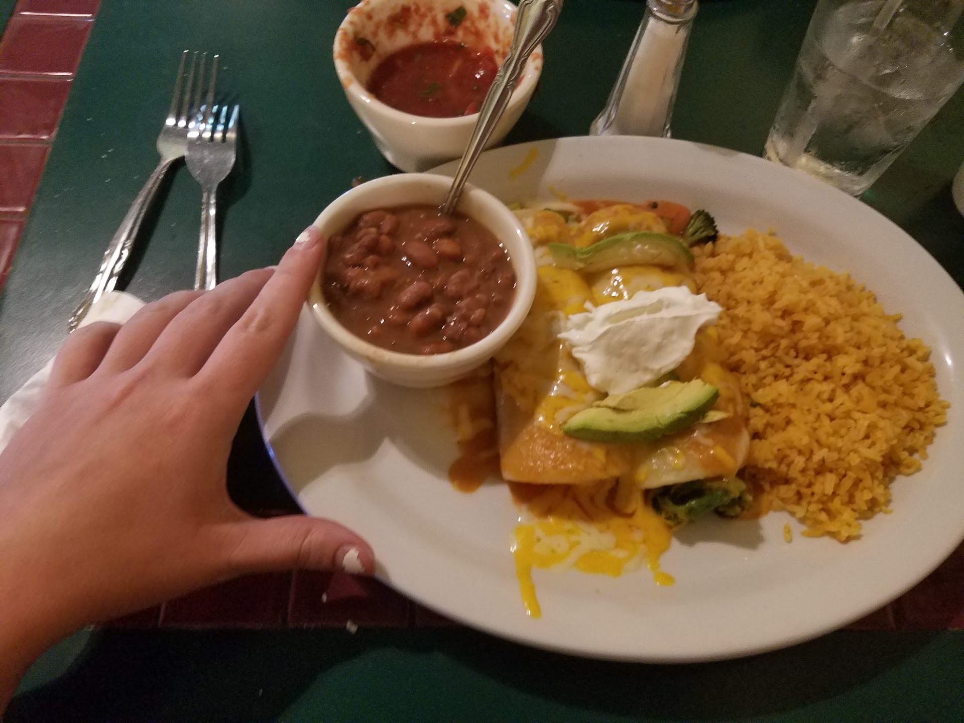 Slowest service EVER. No parking. Service is.... just.... so.... bad..... Bring your own napkins. Theirs are tissue-paper-thin AND they only give you 1 per person. You have to continuously request more tissue paper for your salsa spills. They refill your Sprite with water, so watch out for that... AND when they do get you a refill on your soda they take your used glass and straw into the back, refill it, and bring it back. I was honestly worried about the waitress and her bad attitude spitting in my drink when she brought it back to refill it...... For almost 10 bucks I got a vegetarian enchilada. Looked like frozen Steamed carrots and broccoli inside, a scoop of sour cream, and a couple avocado slices. Taco bell looked more filling after I saw my plate. I'm a 5'5" girl and it just wasn't filling (picture attached). My daughter got a children's quesadilla and a soda. Her children's plate with drink was almost 9 bucks! With refills and tip our bill was almost $30.... for me and a 2 year old.... the second star is for their salsa (which is tasty) and an extra hand girl who continuously refilled our chips and salsa since our waitress was no where to be found. She also picked up the waitress slack and brought us a box for my childs leftover quesadilla and the bill. Our waitress finally showed up again at the end to collect her tip. I wish I had cash so I could tip the girl who actually did all the work instead of our waitress who hardly...