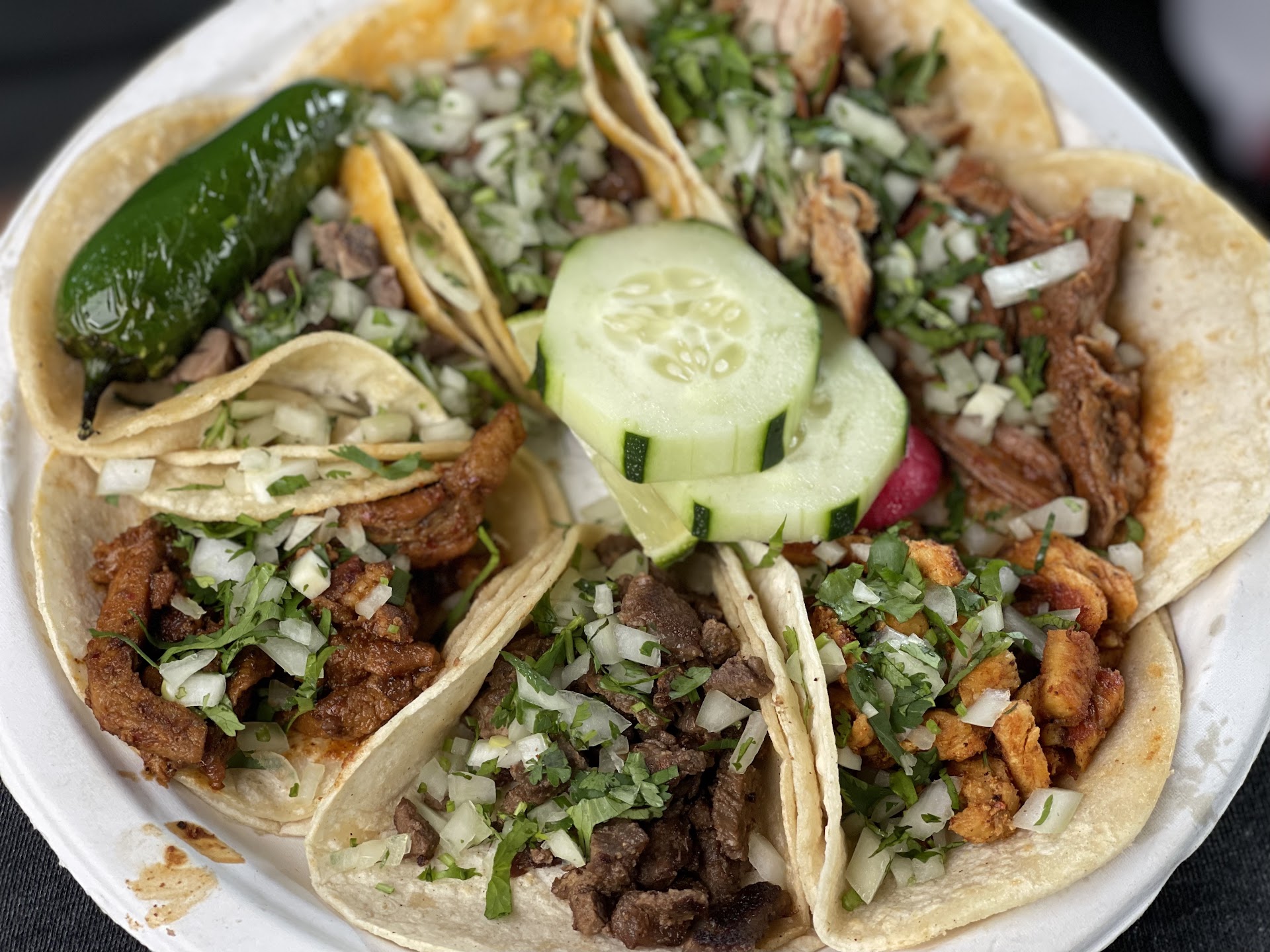 Since it was a Monday, everything was closed and it was getting later so everything else was starting to close. Luckily we came across this place- it satisfied our taco craving and then some! We all got tacos in a few different types. Each type of meat we got was flavorful and didn't need anything else (though the onions and salsa were a nice addition) The meat is also good quality, not junky, and they don't skimp on it, making the taco filling and totally worth your money. A nice extra added to the radishes were cucumber slices, it's something I haven't seen (or at least remember) other trucks around here do and it helps break up the meal between your tacos.