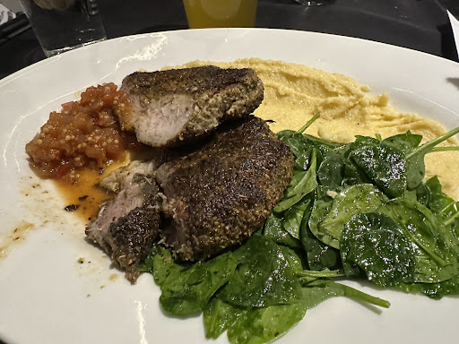 Food - my wife ordered bolognese. I believe it was a 3 meat? Pasta cooked perfectly. Well done back of the house! Sauce was great. It coated the noodles but was not sloppy. My wife killed it and would order again. In order the pork chop. It was Roman spiced which Iām not familiar with those seasoning. It did have a slight kick and if you hate spicy, itās not for you but IMO, it was subtle and brought the pork to life. The pork was cooked medium well which is how itās cooked when ordered. Iām sure you could ask for well done, but please donāt. Iād describe the heat like a chipotle but with a less smoky taste. The grits and spinach were perfect. Honestly, this was the most tender chop Iāve ever had. Absolutely stunned with how they did it. (Note, I may had taken a bite or two prior to the pic because I was selfish and starving. I tried to cover it up for aesthetics)