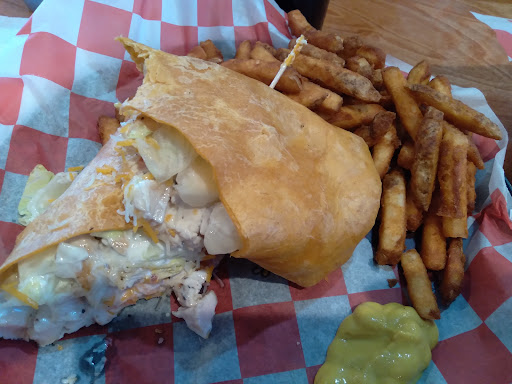 The food is delicious. Several in our group ordered the wing special along with burgers, the stuffed peppers, who's got the beef, and the chopped steak. I had the Home Turf Wrap on the tomato basil wrap, with fries. I also ordered the breaded mushrooms which, according to the menu, is suppose to come with ranch but was instead brought with marinara. Had to ask for the ranch. There is no skimping on the contents of the wraps, packed full of tasty goodness, with a pile of fries. The mushrooms are great - nice and crisp on the outside, but tender on the inside.