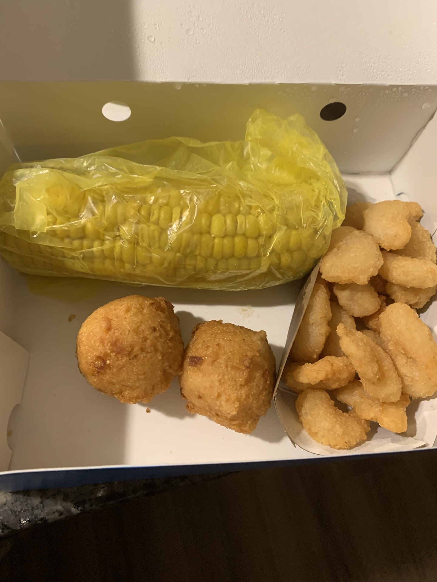 Overall my Deluxe Seafood Platter gets 3.5 stars because the stuff crab needs more seasoning it was too bland. Plus, I had no tater sauce even though I requested it on both my orders. I order the Shrimp Kids meal with Diet Pepsi but it was missing. I had the Superme Sampler as you can see the chicken are now strips not long fillet like they use to be. Just to let you know that the Bake Potato and Corn on the Cob you must pay extra to get it. ($.69) cents more. I give everything else...