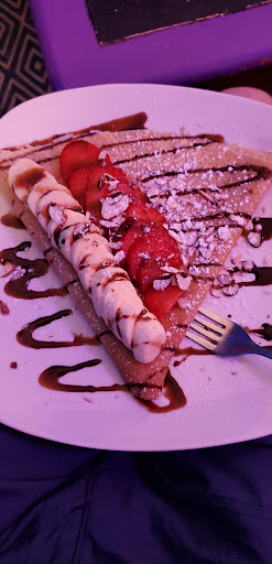 This place is very cool! The crepes are delicious and the coffee is also very good. I have tried a a sweet fruit crepe as well as a savory Hope crepe (with Chipotle sauce, bacon, chicken, mushroom). I liked them both! The atmosphere is really cozy, and I like that there are several rooms with different themes. The front room is kind of shabby chic, the other room is artsy Mexican, then there is a larger room with a Paris theme, and two smaller rooms with a Hollywood & Comics theme. They let you reserve rooms if you have groups larger than 10. There is also seating on the patio. The staff is really nice & they are...