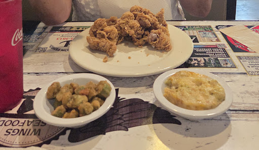 So this place is an example of why our family has opted out of going out to eat BUT we hadn’t eaten in hours and were picking up our daughter from her grandparents and I read the reviews of this local place where I live and figured I would give it a try. I gave this place two stars because one the drinks were flat my husband and I both ordered coke zeros tasted like flat Diet Coke, so order got wrong, then we ordered the green tomatoes for an app… big mistake was soggy tasteless and had melted sprinkled cheese on top which doesn’t even go on fried green tomato’s the “sauce” they served with it tasted like straight mayo so I spit it out. Our waitress got our app wrong and gave us fried pickles and tried to say I told her fried pickles which I didn’t husband vouched cause he saw her give them to the right table. The hot dog my daughter had looked old and wrinkly and dry. The ONLY good thing was the burgers my husband and I had. I had the pimento cheese burger and he had their house burger. BUT I got sick later that night stomach cramps and nauseous. And considering it was the only food I ate that day it’s safe to assume it was from that pimento cheese. Will never go here again. I guess if you go here only order the wings and the burgers except the...