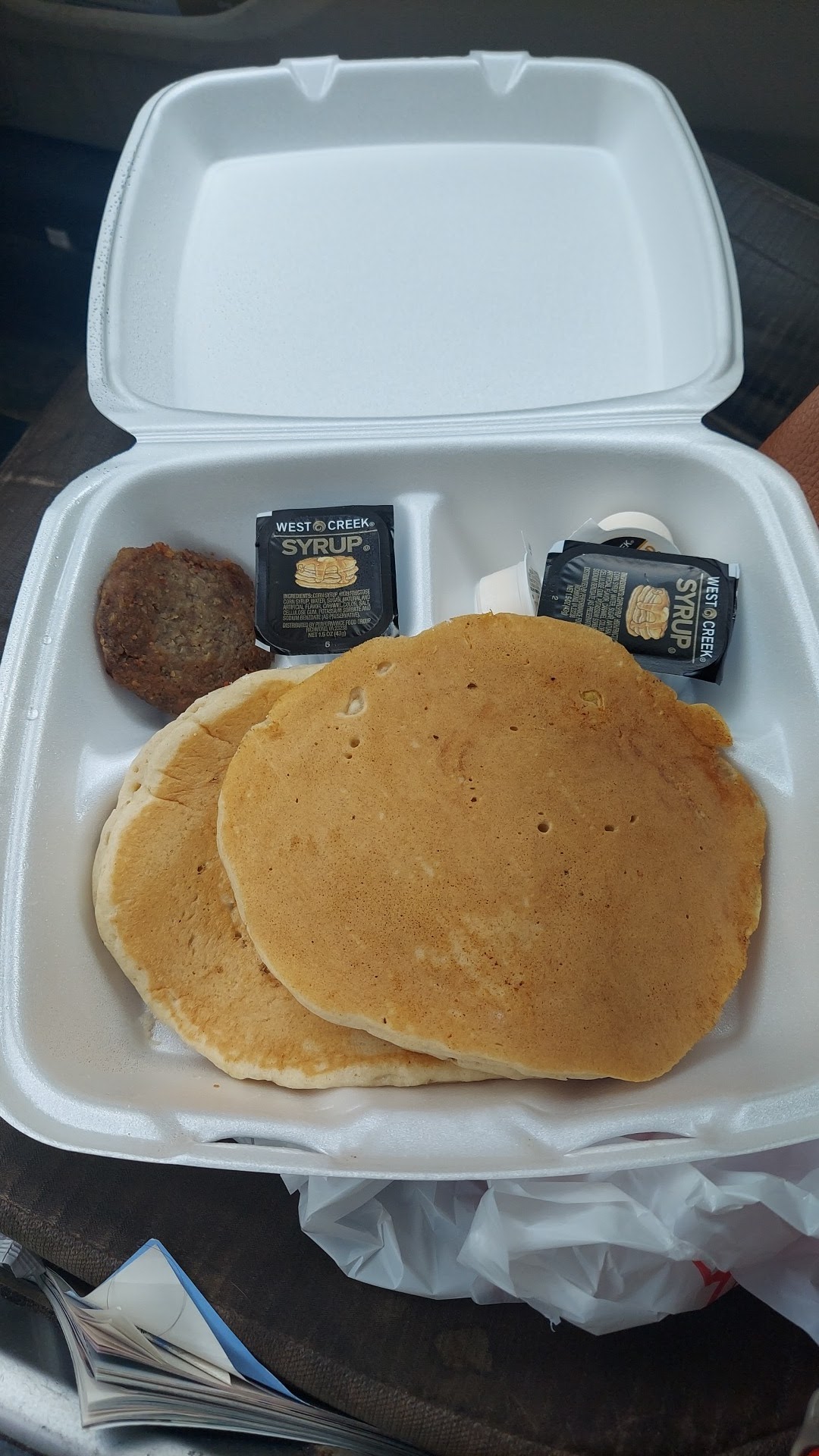 Pros- super friendly staff and fairly quick service( abt 7/8 mins to get food), food was hot Cons- no menu in drive-thru(I asked to see a menu and they said they didn't have any printed), food was pricey for what I ordered(2 pancakes with 1 small sausage patty and sweet tea was over $10), pancakes were rubbery and not very good