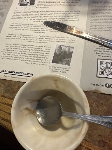 Read moreI have a head to the Black bear diner in Auburn California and the first thing you notice can you get in there is the bear theme which is nice is the second he knows is the menus now the menus are presented like a newspaper style menu so you can read it like the newspaper or you can read it like in the menu which I I appreciate it because I didn’t get a chance to read the newspaper very often so it’s good to catch up on all the latest news. Also as a note it’s not the latest news it’s definitely an old news but still news all news is good news. So we ordered the breakfast menu items which were a very good deal for the amount of food that you get and it had eggs in it and I would recommend getting the pop-up burn hot sauce because of it really burns your mouth but I like that because I like hot things. Yeah I think it moving to mention about the menus it’s on the newspapers or like there’s a lot of and it’s actually kind a hard to pick just one of the items in the sub good which I think is a problem like I like I like West Adams I like clear winners but in this one they all looks pretty good I was hungry so I get to the long time to put the order in I feel embarrassed because the waitress give us a beer ready and we weren’t ready for a long time maybe 20 minutes to read the whole menu The whole menu and because of that it was embarrassing and we had to like isolate the best items and I took a long time. And the worst part was that they don’t put the desert on the newspaper menu it’s a different venue and if I had known I probably would’ve gotten some ice cream because I like ice cream. No it’s talk about the food I would’ve the scramble of some kind and it was tasty they put the color information on the menu which I think is a good thing if you can see how much you want to fill up the food but also you didn’t put you off ordering something stable of calories yeah this is a place that if you want calories you can definitely get calories but if you don’t want to eat all your food they are very nice and gave you takeout boxes see you can eat them in the car later which is what I might do right now interesting four stars...