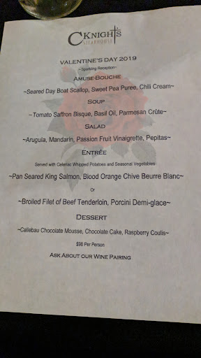 Read moreCame here for an early mother's day. Boy was I disappointed. Utterly disappointed. Maybe I was in the wrong for having high expectations, having come from steakhouses in San Francisco and New York City, but the meal I had at C. Knight's Steakhouse is in my opinion, an atrocity to steakhouses in general. I will say that the waiters and staff are friendly. But that's where the positive remarks end. There's not a whole lot of variety on their menu, very few items. My party ordered a flatbread to begin, and it was just average. Then the entrée's came out. My father and I ordered a 12oz rib eye. Never have we seen such a thin piece of meat. It was the proper size when you looked at it from the top, but the steak itself was about as thin as my pinky. Not to mention that my plate was drowning in sizzling butter. I'm happy to see if they use butter on a steak to enhance the flavor, but since my father got the same order, I saw how I had like triple the butter he did, and it was alarming to see the inconsistency. Additionally the steak lacked flavor, like they forgot the salt. My mother ordered a salmon dish over risotto. The salmon was average, and the risotto didn't have flavor and was too cheesy. Finally the sides were the final nail in the coffin. They don't carry your typical steakhouse baked potato (which is fine) so we ordered fries and the seasonal vegetables which happened to be brussels sprouts and carrots. Fries didn't have flavor and felt like cardboard. The vegetables were hard like they weren't cooked, and were drowning in oil in the bottom of the dish (not something you want to see when trying to have a healthy side dish) Overall my family was incredibly disappointed and will not be returning. If you are craving the very typical and traditional steakhouse formula, you too will surely be...