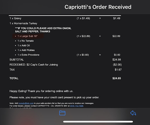 So, the owner indicated that he would refund my order and simply have me re-order the food through Door Dash again. Easy-peasy - right, but it was to close to closing hours and I could no longer order through Doordash. After calling Capriottiās back, the OWNER, Damien, personally got in his car and delivered our food for us! š® Who even has that kind of compassion these days? It seems like COVID has brought the worst out of a lot of people, but not Capriottiās! The owner felt so bad for the mix up and even included a little treat! š¤¤