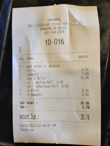 Ā Ā Ā Read moreI give a one star because it was over priced. Had 2 rolls, 3 12oz beers and a large hot saki. It cost me $80 bucks. I usually go to darumaya in Beaumont. Great sushi. Get 2 rolls, 2 small hot sakis and 2 22oz beers and for only $40 bucks!! Honestly this place didn't even ask what size I wanted the saki or the beer. Just served it. The sushi was ok but Darumaya was better. I like to try sushi places and compare but never again will I come here. Sushi for one shouldn't be $80 dollars. I truly think she up the prices on me. Sad cause that's not how you keep customers. I don't see many negative reviews that's why I'm very surprised on my experience. Oh well hope you have a better experience. Eat here at your own risk. *Photo is receipt of Darumaya. Sake is 3 bucks for a small, large may be 6 so my 80 dollar bill here doesn't add up. Plus had more beer at Darumaya then here ...idk just...