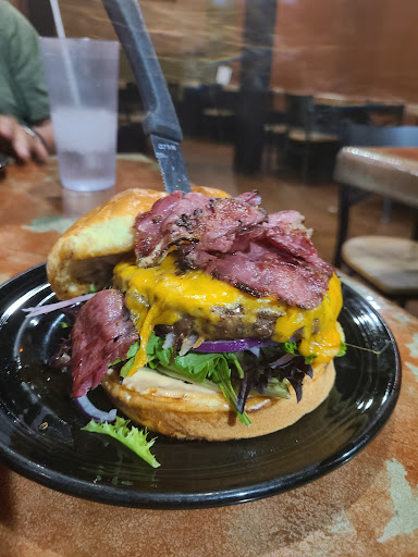 I really wanted to like this place, I love burgers, probably my favorite food. This place came highly recommended from a friend of mine who goes annually to the burger battles. I wish there was a way to rate the service separately from the food. The service (once we were seated 20 minutes later on a Tuesday night), was excellent. The food, not so much. There were 9 of us eating on this Tuesday for a birthday celebration. While standing in the restaurant waiting to be seated there is a TV monitor going through various items on their menu. I was intrigued by the monster burger so I ordered it. Everyone else ordered different types of burgers too so we had a wide variety of their menu at our table. All but 1 of us ordered their burger medium and the 1 ordered his burger well done. As our food trickled to us over about a 10 minute period, we all received extremely well done burgers. So much so that there wasn't any juice left in the meat! Mine was dry as a bone. Unfortunately for me, I was unable to eat my $30 burger. I was unaware that it was caked with Jalapenos and then infused with a habanero liquid sauce throughout the entire burger. The burger isn't on the menu and I only found out when I asked the waitress why my burger was so hot. My mouth was on fire after 1 bite. If you like hot you'll love this burger! The fries that came with the monster burger were very good though! This is not a place to go with more than 4 people because they are not set up for groups. There is no where to seat them. Also,the location sucks. There was literally no one in the mall yet finding parking in the parking lot on a Tuesday night...