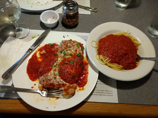 The not so good: the food. The salad was reasonably priced; until it arrived. Literally 6 leaves of iceberg lettuce, 1 slice of tomato, 2 small olives and a sport pepper. The side of dressing that is usually barely adequate made this salad over-dressed. The veal parm tasted like it was bought ready to cook. Waaay to thin. It was baked instead of fried, but that was another issue. Part of it was done, part of it was burnt. They tried to hide it with the cheese, but it wouldn't stick. The spaghetti noodles were okay, but the sauce was bland. The sauce wouldn't stick to the noodles. They bake their own bread. The crust is very chewy and the bread is very holey. They pre-cut it halfway through but the crust is so tough that you end up smashing the bread trying to tear off a hunk. Not a normal Italian style bread. It tasted pretty good, but it wasn't much use for sopping up sauce.