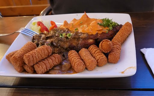 10/2020 sampler plate... hmm where's the spaetzle? Where's the red cabbage? Hunter sauce Ok, and not very much of it, and a little under seasoned. Two different kinds of sauerkraut one was the traditional and the other one, I don't know what it was, but it was really good. Meatballs were okay. The sausages were good.