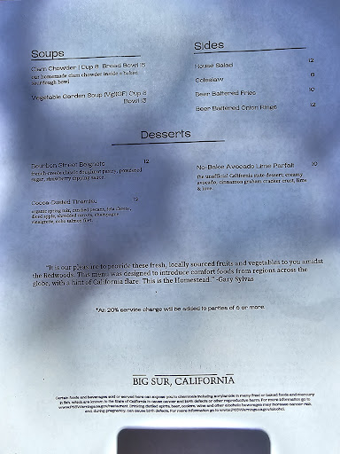 Read moreI'm very surprised this place has a 3.7, it was really good! My friends and I had a hard time finding a place to eat for dinner while we were driving through Big Sur, and we were extremely hungry and decided to eat at Homestead, and it was such a pleasant surprise! I got the hot chicken sandwich and it was tasty, it was the right level of spice (like a medium, wasn't wanting anything super spicy on a vacation day) and the service was fantastic! It's definitely a bit on the pricier side but it's in a lodge and there's really not many places nearby. I will say the onion rings were very mid, not much flavor at all and not worth the up-charge...