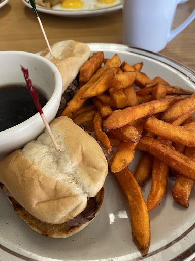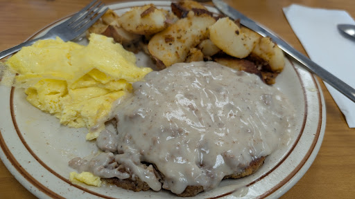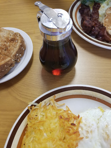 My boyfriend ordered a ham and cheese inlet w/hash browns and toast and he said it was DELICIOUS! The sourdough toast was thick, the hash browns thick shredded, and the ham was like thick ham steak in the omelet! Can’t go wrong with this classic! I ordered the Belgian waffle meal with bacon, extra crispy, and an over medium egg, side of syrup and peanut butter for the waffle, and it was fantastic! Truly one of the best Belgian waffles I’ve ever had! Crispy on the outside, soft and lightly sweet on the inside! We also got orange juice, which was good, too!