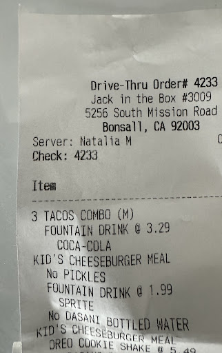 Read moreHorribly rude young men AND girls working here at the counter. They now have just screens to place your order AND pay. It was recently changed at this location and, after at least 5 minutes of standing there aI finally asked someone for assistance OR if they would take my order. The kid in the back just gestured at the front and grunted, "Yeah, you gotta do it on there..." I asked if I could have a hand since I am visually impaired. He sauntered up and went through the screen, making mistakes along the way. I said, "Well, I guess it's not THAT easy, huh?" We had trouble with my bank card and he said, " You don't got no other card?!" I said, "No" He shrugged, walked to the back and mumbled, "Well, I don't know, then." That's it I was so disgusted. I haven't been back. McDonald's is the only other quick place near me in Bonsall. And NOW, they don't have the opinion receipts, anymore?--...