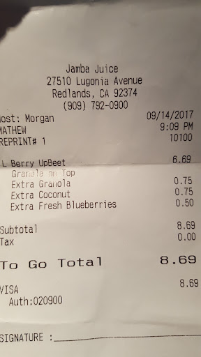 Read moreCould not make a dream machine yesterday out of ingredients at this store. Had an issue before with this one before as well as the one off Tippecanoue. Called corporate 800 number just now about my last 3 tries at Jamba and she was also RUDE! Was trying to explain my last 3 visits and she was like sir I do not care just tell me about the most recent and only 1 address. Just cut me off! I work at Loma Linda Hospital. Thanks Jamba. I am WAS a regular customer and I am 45 years old. Guess I am done with this place. Wasted time and gas to NEVER get what I want 3 times in a row. Was obsessed with Jamba but no more. They do not want my business or to make it right. Can. NOT. believe how I was treated at customer service corporate! You can also read my review from 7 months ago at the san bernadino store which never contacted me back. Tried this one a couple miles away and does not seem to be much better. I give up. Thanks for the previous 20 years. Guess I give up. The stores where I am from in Portland Oregon never treated me this way. Since I have been here 2 years in Cali it has just ruined any hope of going back I guess. Corporate certainly solidified...