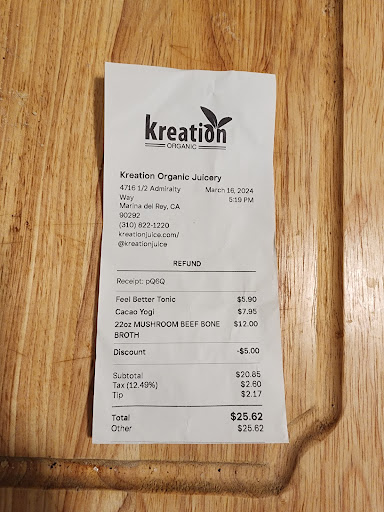 I placed an order with Kreation Organic - Marina del Rey for 1 x Feel Better, 1 x Cacao Almond Yogi & 1 x 32 oz. Beef Bone Broth. Order #248724696. They did not have the Cacao Almond Yogi and I was offered a replacement item (Cacao Vegan Pudding) that was nearly $2.00 cheaper than the Cacao Almond Yogi even though she told me the item was the same price as what I had paid for. They did not have the Beef Bone Broth 32 oz., and gave me Mushroom Beef Bone Broth 22 oz. Neither replacement item was acceptable so I requested a refund. Upon looking over the receipt they charged me 12.49% sales tax when the sales tax in Marina del Rey is only 9.5%. I have yet to receive a confirmation of cancellation or refund via email as I was told and it has been over 90 minutes since I left the restaurant. I have tried calling them multiple times and they are not answering the phone, despite being open for another 108 minutes. I tried calling them a 4th time, this time blocking my number and they answered. The girl asked for my email address and told me she had sent the confirmation email with receipt, yet 10 minutes later I still haven't received it. This place are crooks and advertise items on their own website that they are either sold out of or do not even offer. Stay far away, worst Kreation I've ever...