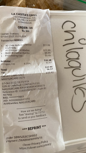 went here for date night with my wife. i drive past here often and always was looking to try it. food definitely did not disappoint. i ordered a california burrito and my wife got a bean and cheese burrito. first thing i did notice when i stepped it was the restaurant was huge and fit the vibe. prices were okay, pretty normal nowadays for mexican. the service was not all that great, i typically don't care too much about service as long as the food is good. the guy taking my order just kinda seemed to be over it, which i understand, and just was listening to music. 7/10, he did his job so again the service isn't too concerning for me. when we got the food i noticed both of our burritos were huge which i loved because that means i get all 14 dollars worth of one burrito. and the best part, they throw in a free bag of chips with every order. those chips were good, very addicting and they were fresh. the salsa that they offer, a basic red and green, was VERY good especially the green salsa. better than at most places i have and went great on my burrito. and the burrito itself was very very very good. hands down one of the best california burritos i have had in a while. i swear the burrito was at least 6 inches long. my wife loved her bean and cheese burrito very much as well. it's kind of hard to mess up one of those, but she said it was a very flavorful burrito. i would recommend it to anyone in the area looking for some mexican, not burro and fries and not cotija's, la casita's mexican is the place to go. i was very pleased and will be back next time...