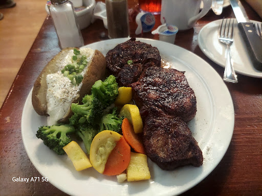Between the two of us we tried the Shrimp cocktail (super fresh), Chicken noodle soup (homemade thick noodles), Side salad (perfect portions), Prime rib (still dreaming about the texture), baked potato, rice pilaf and mixed veggies (each just right). FYI - The optional side of sautéed mushrooms packs a punch of garlic and the homemade bread is to die for. We loved the flavored ice teas and generous beverage size. It's unusual for a meal out for us where every single thing is good, but in this case everything we had was so fresh, delicious, and perfectly cooked, we seriously regretted not saving room for pie. (We envied our table neighbors who were there celebrating their anniversary as their pie was delivered; they smartly had gotten to-go boxes instead of finishing their plates).