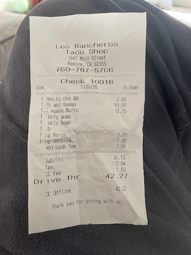 Read moreWhat a crap place! Okay, check this out...I order a carne asada burritos and the cashier lady tells me $5.60. I give her my credit card and I see the charge is $6.02. I ask why I was getting charged more than the price she just gave me 20 seconds ago and she tells me that it is for a credit card transaction fee. I said, "What transaction fee?" Then, the cashier lady slides the take-out window closed, which suddenly revealed this credit card transaction fee...ROTFL. It was hidden entirely when I ordered AND I was uninformed about it when I gave the cashier my credit card.