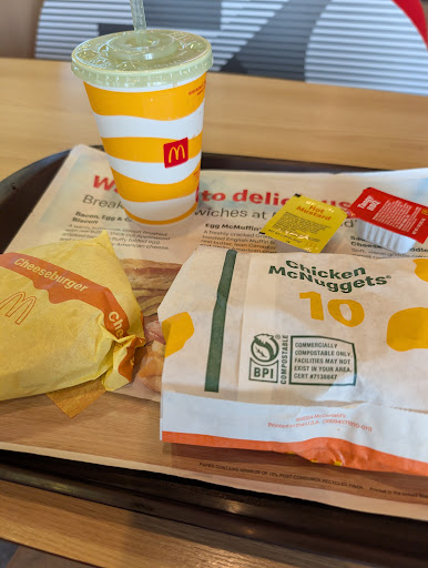 Read moreTypical McDonalds. Went to the drive thru however they must've been having issues because we did not move for 10 minutes, the second drive thru was closed. Decided to cut out, park and order inside. Used the app and ordered 10 piece chicken McNuggets using the 50% offer. Also order a cheese burger and a small coke. The McNuggets were fresh and hot, I had them with bbq and hot mustard sauce. The cheeseburger was just ok and the coke lacked ice. The self-serve soda dispensary was unavailable and you have to get refills going to the counter. This location has the kiosks to place your order. Bathrooms are available, will need to request the code to get in. Sitting arrangements vary depending on need. Parking is plentiful as well as having a wheelchair accessible entrance. Again a typical McDonalds, some locations have blown my mind with the freshest of food, but this location...