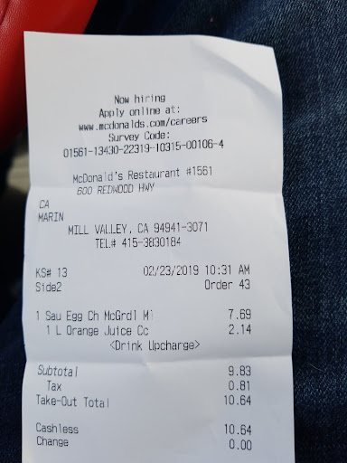Another time I was charged $3 for a large tea (the difference between a large tea and a small tea is more hot water!). When I mention the oddness of this to the cashier thief, he simply shrugs and says yea it's weird but that's how it is...again no receipt is issued! I generally avoid businesses in the crook-run Marin County, where even their court house is run by a clique of crooks, but I think this Mcdonald's is particularly noteworthy as they must be stealing well over $2000 per day considering the kind of volume they get here. I think anyone that is so stupid as to steal right in front of you should be considered suspect on other aspects such as health and food safety...avoid this place (and marin...