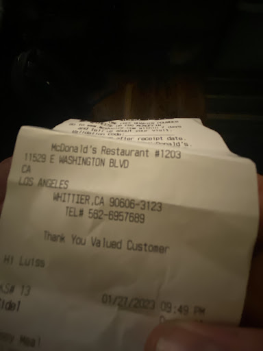 Read moreFast, professional service. Quality of food is consistent and tasty. Staff is friendly and respectful. Items are fairly priced. 10/8/23. I waited several months to post this update as I wanted to give this particular restaurant a fair chance to recover thinking it was just going through a rough patch. This whittier site is in dire need of a knowledgeable store manager. The orders now are mostly wrong with upset customers experiencing long waits and others having to come inside after going through drive through. All the original staff that were there when I first posted and had been working for at least a couple or more years are gone. Now I see new trainees on every visit and a few seem lost and others not fully trained. You need to double check your order each visit because either eating utensils or pancake syrup and even food is missing from the order. I have to change my star rating from 5 to 2. The bad part is that the entire McDonald's franchise chain is going through the same trouble as far...