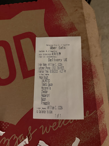 Read moreWe ordered a pizza with three toppings (more expensive) but received a one topping pizza. I ordered it through Uber eats, but figured since it was the restaurant’s mistake that they would do something to correctly the mistake. But they said “there is nothing they can do” the Uber eats deliver is not the one that put my receipt on the wrong box and sent it out the door. There is even a sticker on it so it can’t be opened and checked. This was our first time eating here and it will be the last. Customer service makes or breaks a restaurant for me. $30 dollars for a delivered pizza is a bummer but not worth spending anymore time on hold with Uber eats support. The pizza was okay. We ended up eating it after we realized that wasting more than 20 minutes on the phone over a pizza was silly. But I will stick with our go to Tomato Joe’s and Vincenzo’s from now on. This is me being lighthearted - “nothing like expecting delicious bacon and pepperoni, but getting...