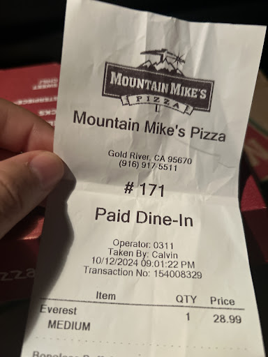 The pizza was very good and hot! The heat lamps were working very well. Good thing, nothing better than hot pizza for sure. The pizza of course was the typical, great ingredients Mountain Mikes!