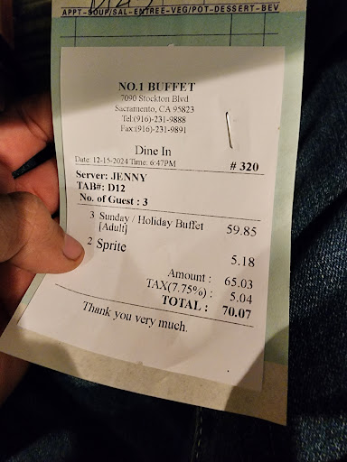 Read moreI am sitting at No. 1 Buffet right now as I write this review.... The food was somewhat okay depending on if you're accustomed to the cuisine. Me being very skeptical, was hesitant as the majority of the seafood looked like it had just jumped out of the ocean (jumped out of the ocean to sit uncooked only to be cooked days later and then served cold). I'm not sure the food that was from dry land...chicken, beef, pork was labeled correctly. I was somewhat afraid that I was munching down on cat or dog. The sushi was cold and seemed...stale, the coconut shrimp was a disappointment, and the crab was waterlogged.