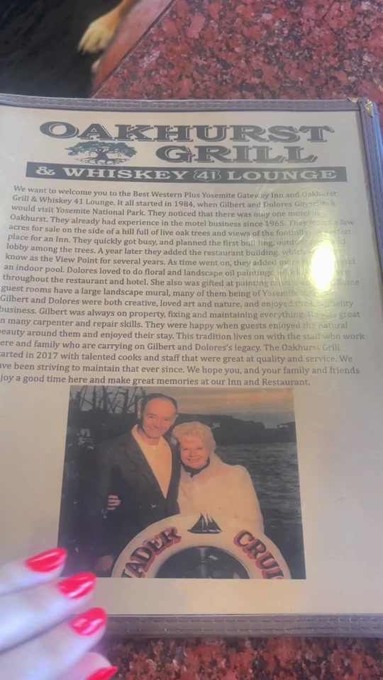 Ā Ā Ā Read moreThis place is amazing, if you every want to go to a good restaurant when visiting Yosemite, this is the one. The servers are so polite and nice. Both inside and out were sanitized properly and all the workers wore mask. Form the outside it looks a bit rundown but when you actually go in itās really nice and neat with a bit of a old-fashion vibe to it. There are really cute bear models outside the grill which are great for pictures. Now talking about the main part of a restaurant...the food, it was amazing. The menu was online and can be accessed threw google maps. They also offer you to scan a code for easy access of the menu before you get seated. Everything was so planned out for the pandemic and also just in general. My family ordered the Pink Lemonade, Salmon Hawaiian Kabobs, Shrimp Alfredo, Filet Mignon -medium rare, Creme BrĆ»lĆ©e, and Cheesecake Bites. Everything were the perfect portion. The lemonades color was so pretty, it was a perfectly sweetened very refreshing drink. The Hawaiian Kabobs were plated so beautiful, the salmon was cooked to perfection and the sauce was a perfect match. The Shrimp Alfredo was not overcooked by one bit and the sauce was so creamy. The Filet Mignon was cooked perfectly and was so tender. The mashed potatoes that came with it were wonderfully seasoned and very soft. The desserts were amazing too. The creme brĆ»lĆ©e was not overly sweet and was the perfect size. The cheesecake bites sweetness was also balanced perfectly with a hint of a raspberry coulee. Their food service was also super fast and efficient even when there restaurant was packed. The servers also checked in on you very often to make sure you were happy with your meal and all. The food was a little bit on the pricier side but it was definitely worth it. This place is pretty much perfect. Iām very happy with what l got out of this place. I definitely recommend this place to anyone whoās looking for...