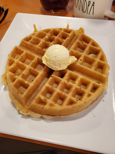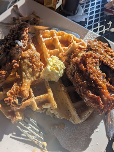 We enjoyed a very nice brunch here recently. There was outdoor seating available which was nice but small. We opened the large umbrella over the little table at some point to keep it out of my son's face. When closed, the bottom edge was too close for comfort and convo. My son ordered the country fried steak and eggs with biscuits and gravy. Although we both thought the gravy could have had more sausage, the biscuits and gravy were pretty delicious. I didn't try the steak but he loved it. My meal of chicken and waffles was quite tasty. The bone-in chicken was incredíbly crispy, large, and delicious. The waffle was cooked to perfection, also with great crispness and a lovely golden brown color. The details I longed for, maple syrup and browned butter, were not present. The lovely waffle was a bit lacking in flavor. Still, the food earns a solid 4 stars and minor adjustments could bring more. Service...